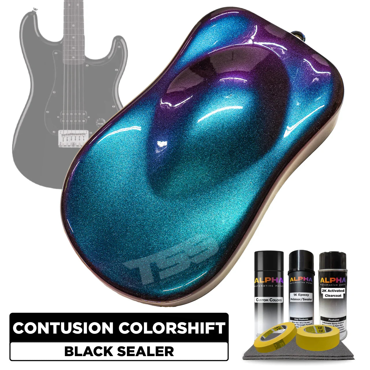 This Guitar Paint Kit includes everything you need to paint your custom guitar Contusion Colorshift. From the primer, basecoat, and topcoats to the optional prep and masking materials – each item has been specially put together for you in one all-inclusive bundle. You simply choose the desired color, project type, finish (Matte, Satin, or Gloss), and optional add-ons. Then we handle the rest. Doesn’t get easier than this!