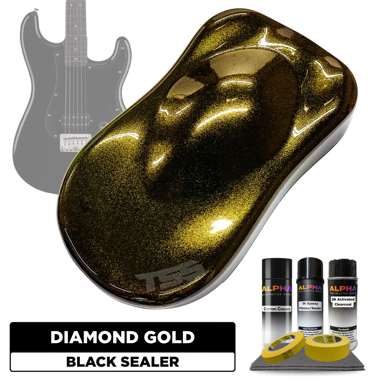 This Guitar Paint Kit includes everything you need to paint your custom guitar Diamond Gold. From the primer, basecoat, and topcoats to the optional prep and masking materials – each item has been specially put together for you in one all-inclusive bundle. You simply choose the desired color, project type, finish (Matte, Satin, or Gloss), and optional add-ons. Then we handle the rest. Doesn’t get easier than this!