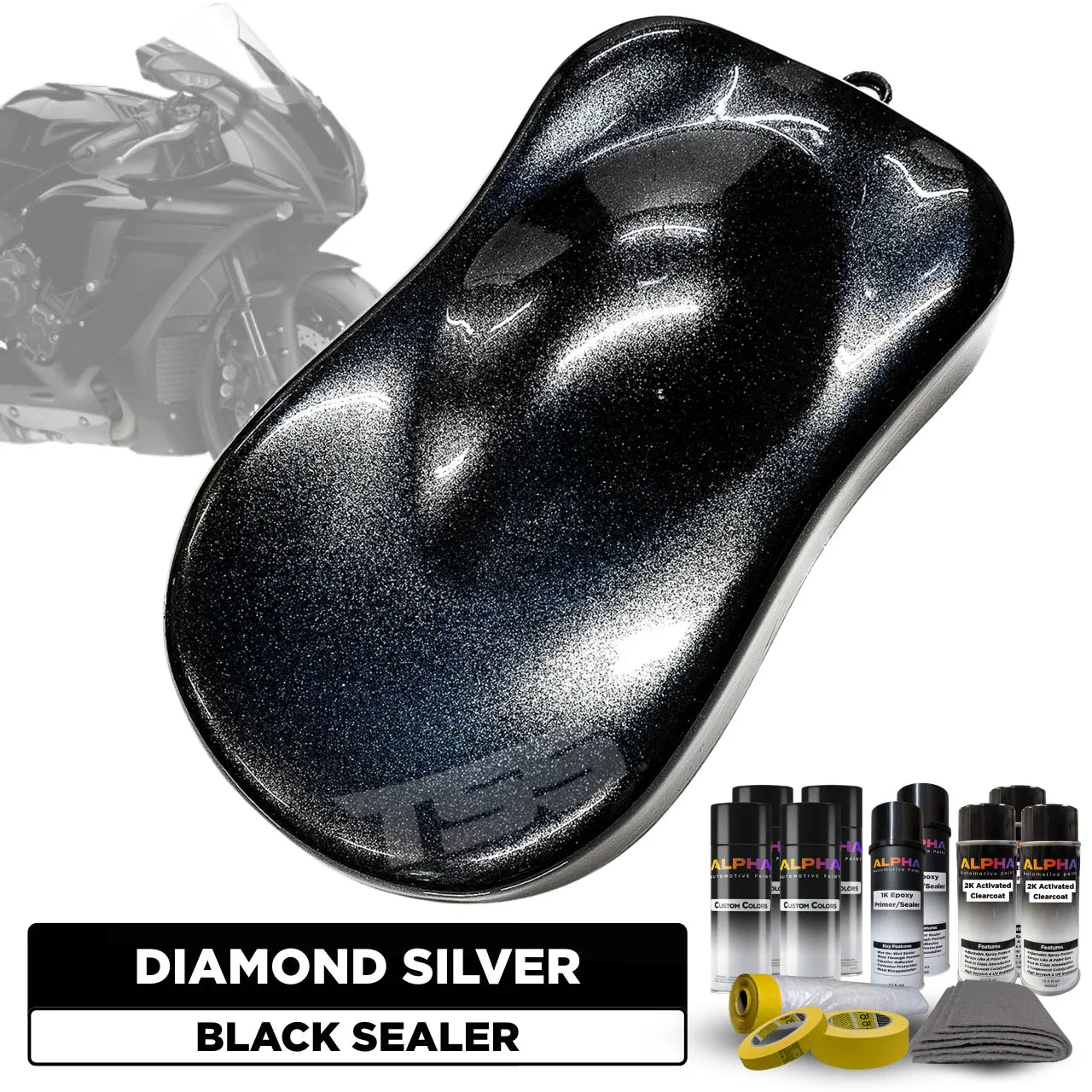 This Motorcycle Paint Kit includes everything you need to paint your motorcycle Diamond Silver. From the primer , basecoat, and topcoats to the optional prep and masking materials – each item has been specially put together for you in one all-inclusive bundle. You simply choose the desired color, project type, finish (Matte, Satin or Gloss), and optional add-ons. Then we handle the rest. Doesn’t get easier than this!