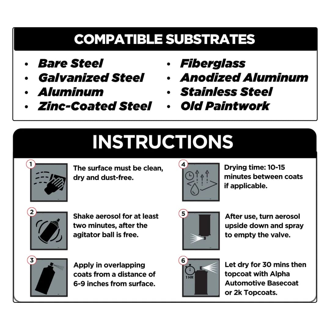 This product is also fully compatible with all Alpha Automotive spray cans and basecoats, making it a perfect foundation for your entire paint process—from primer to final finish. Topcoat without the need to sand 15mins after its dry to the touch, up to 24hrs. Past 24hrs scuff with 600g before applying basecoat.