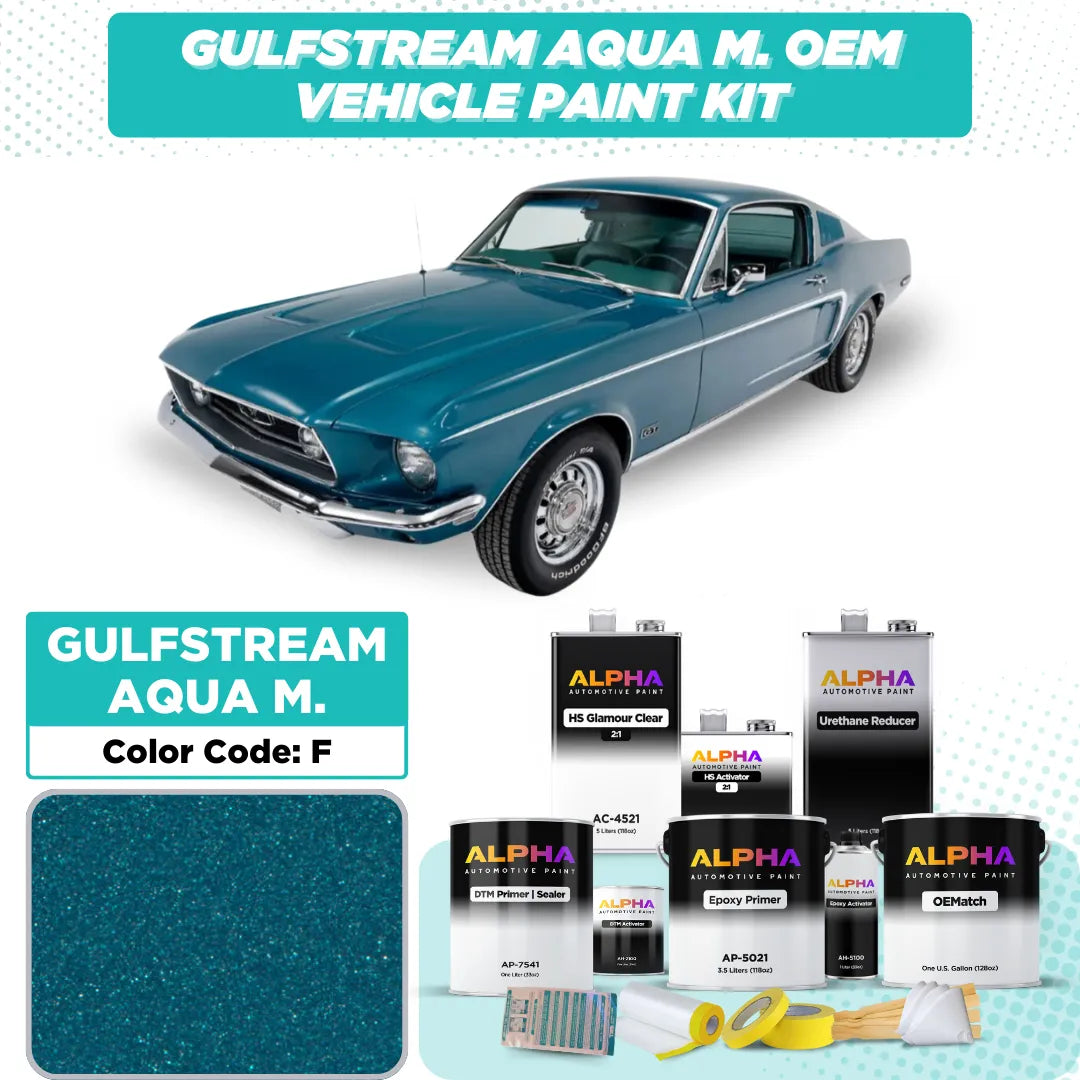 Revitalize your classic Ford with Ford Gulfstream Aqua F OEM Matching Automotive Paint. This stunning metallic aqua color, featured on iconic models like the 1968 Ford Mustang and Torino, delivers an exact factory match to Ford’s original Gulfstream Aqua. Whether restoring a vintage Ford or adding a fresh, custom touch, this paint offers a brilliant, high-gloss metallic finish that highlights the vehicle’s sleek lines.