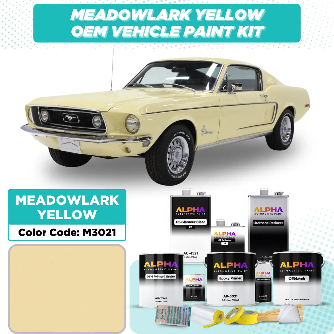 Give your classic Ford a fresh, iconic look with Ford Meadowlark Yellow M3021 OEM Matching Automotive Paint. This cheerful solid yellow, featured on classic models like the Ford Mustang and Thunderbird, offers a precise factory color match for restorations or custom projects. Whether you’re restoring a vintage Ford or adding a vibrant, high-gloss finish to your build, this paint delivers a smooth, high-gloss solid finish that highlights the timeless design of your vehicle.