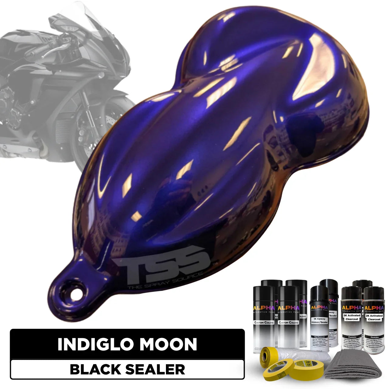This Motorcycle Paint Kit includes everything you need to paint your motorcycle Indiglo Moon. From the primer , basecoat, and topcoats to the optional prep and masking materials – each item has been specially put together for you in one all-inclusive bundle. You simply choose the desired color, project type, finish (Matte, Satin or Gloss), and optional add-ons. Then we handle the rest. Doesn’t get easier than this!
