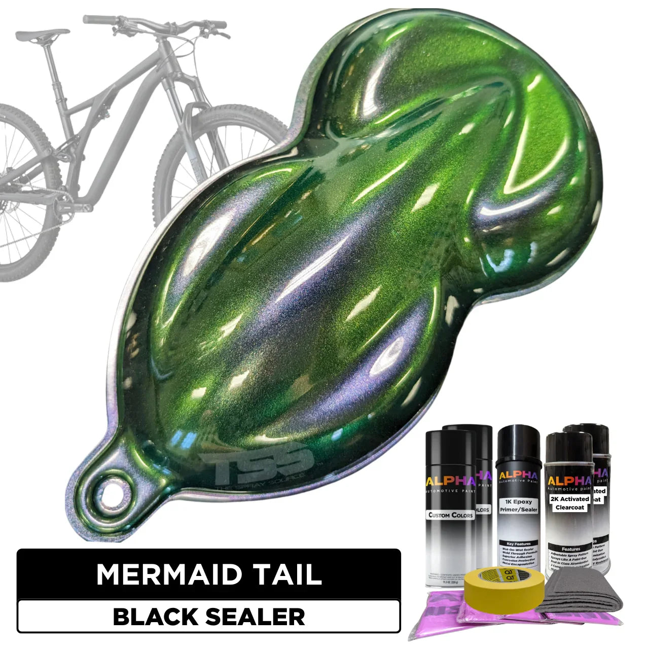 This Bike Paint Kit includes everything you need to paint your bike Mermaid Tail . From the primer , basecoat, and topcoats to the optional prep and masking materials – each item has been specially put together for you in one all-inclusive bundle. You simply choose the desired color, finish (Matte, Satin or Gloss), and optional add-ons. Then we handle the rest. Doesn’t get easier than this!