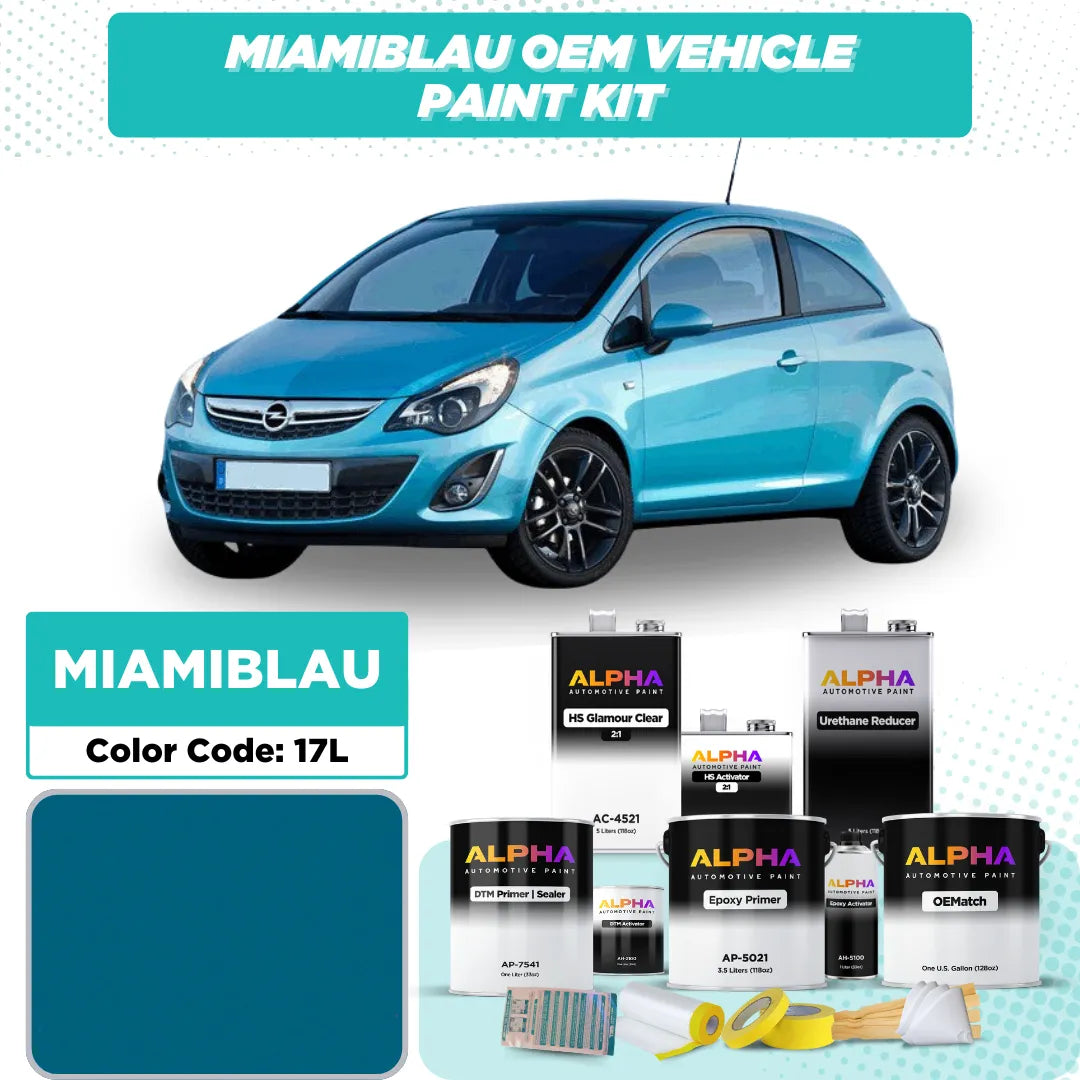 Add a vibrant and contemporary touch to your Opel with Opel Miamiblau 17L / 272 OEM Matching Automotive Paint. This striking solid blue, featured on models like the Opel Corsa and Astra, delivers a precise factory color match with a bold, smooth finish. Perfect for touch-ups, restorations, or custom projects, this paint brings energy and modern style to your vehicle.