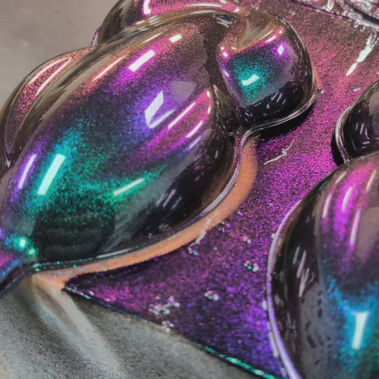 is a strong color changing pearl pigment that has purple/green/blue/bronze/red tones. This color is great for full coverage color change applications (over black) or as effect over other colors like red green, or blue.